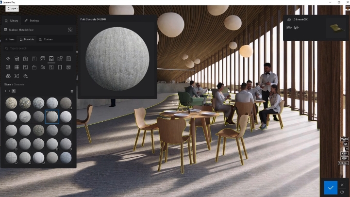 Crea texturas casi tangibles usando el flujo de trabajo PBR o elige entre los 1.500+ materiales de alta calidad disponibles en Lumion Pro.